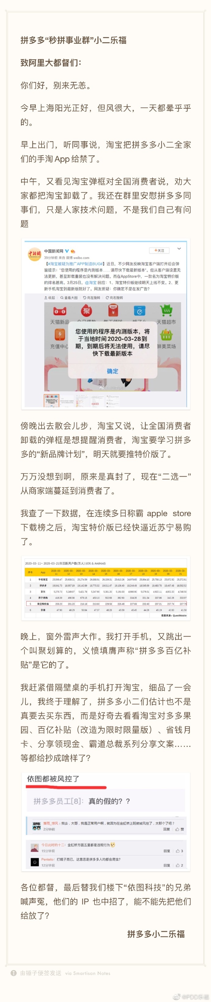 @PDD乐福在回应中称,淘宝把拼多多小二全家们的手淘App给禁了,连拼多多上海总部楼下的“依图科技”的IP也中招被风控了。还提到淘宝对多多果园、百亿补贴、省钱月卡、分享领现金、霸道总裁系列分享文案进行了抄袭。