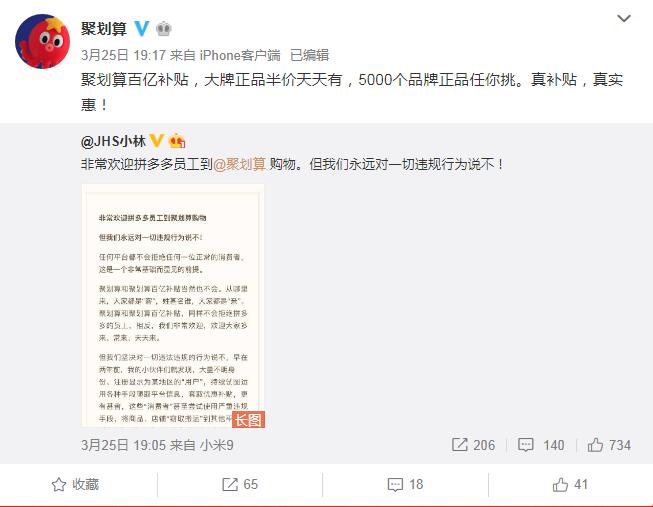 针对此事,聚划算官方微博转发了自称是聚划算小二的“JHS小林”微博声明,该声明表示,淘宝旗下的聚划算不会拒绝任何一位“正常的消费者”,不会拒绝拼多多的员工,但“坚决对一切违法违规的行为说不”,“我们不屏蔽亲,我们屏蔽坏人。”并称对相关话题的水军进行了举报。