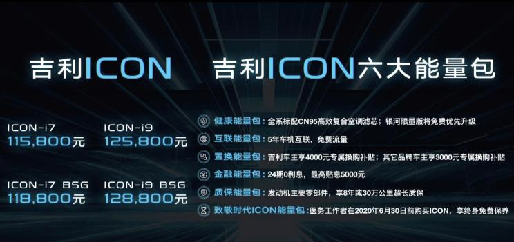 吉利ICON是吉利汽车2020年着力打造的一个重要车型,原本预定于2月14日正式上市。但是受近期新型冠状病毒感染的肺炎疫情的影响推迟到了今天才在网上搞了一个线上发布会。新车一共推出两种动力共四款车型,简单来说就是分成燃油版车型和48V轻混车型这两种动力。每种动力中各有两个车型,分别是低配的i7和高配的i9车型。