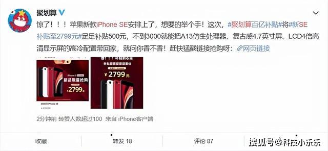 与此同时,其他第三方电商平台围绕iPhone SE开展的一系列优惠活动也蜂拥而至。包括以旧换新、24期免息,以及号称百亿补贴等各类形式的促销活动,例如最热衷于打价格战的拼多多,又一次喊出百亿补贴的口号,以补贴的形式将iPhone SE的价格拉低400元,而紧随其后,国内第一电商巨头阿里巴巴旗下的淘宝聚划算也迅速跟进,将iPhone SE的价格直降500元,官方售价为3299元的iPhone SE被硬生生的变相降价至2799元。电商渠道不惜自掏腰包以补贴促销的形式集体降价,让原本就定位不高的iPhone SE性价比变得更为突出。