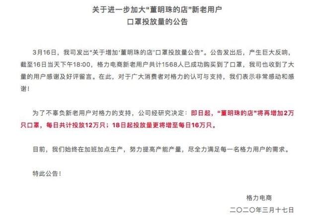 公告表示,截至16日下午18:00时,格力电商新老用户共计1568人已成功购买到了口罩,对于广大消费者对格力的认可与支持,非常感动和感谢,目前正在加班加点生产,提高产能产量,尽全力满足每一名格力用户的需求。