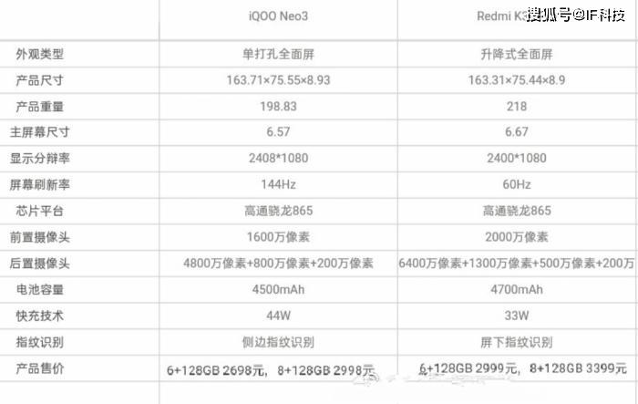 将iQOO Neo 3和Redmi K30Pro进行对比,可以发现iQOO新机除了刷新率和有线充电,其它硬件配置均不如K30Pro,另外大家也知道,LCD屏幕支持高刷新率基本达不到效果,要调好144Hz刷新率,成本费都不止2698元,之前Redmi K30也用了120Hz,价格仅为1599元,但很多用户吐槽这刷新率很60Hz没区别。所以说刷新率不能看数字,屏幕素质和手机厂商系统优化有着决定性作用,比如60Hz的iPhone11手机,流畅度全局领先安卓90Hz,接近120Hz。对于iQOO Neo 3采用骁龙865+44W快充,你觉得该机值2698元吗。