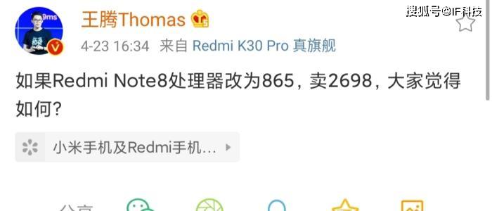 随后小米高管王腾发动态称“如果Redmi Note8处理器改为865,卖2698,大家觉得如何”,疑似嘲讽iQOO Neo 3是一款中端机将处理器换成骁龙865。随后王腾又立刻发文表示“上一条帖子开个玩笑问大家在Note8的基础上改865卖2699大家要不要,没想到真有些同学回复想要”。
