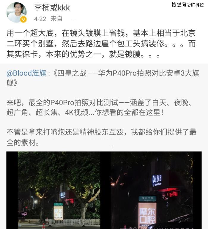 然而魅族前副总裁李楠转发该测评视频嘲讽称“用一个超大底,在镜头镀膜上省钱,基本上相当于北京二环买个别墅,然后去路边雇个包工头搞装修。而其实徕卡,本来的优势之一,就是镀膜”,显然是在嘲讽莱卡四摄的华为P40pro表面用了一颗不错的索尼传感器,然而却在镜片镀膜上省钱偷工减料。