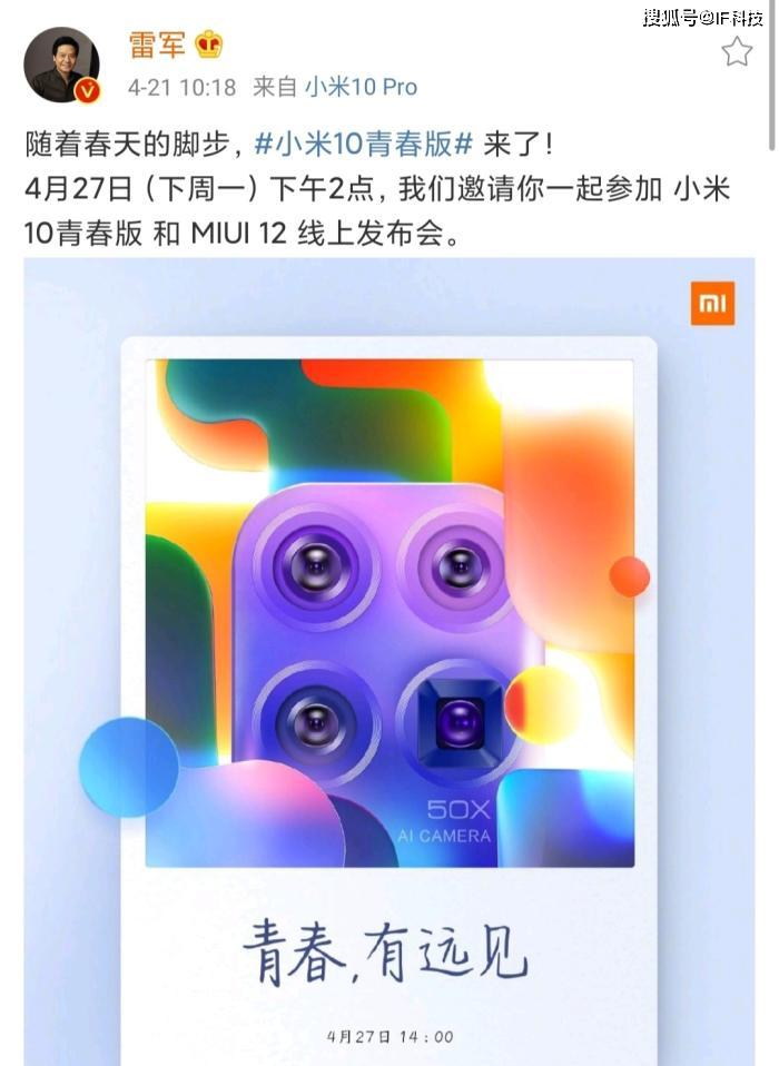 小米官微今天宣布将于4月27日(下周一下午两点)发布下一代定制系统MIUI 12,同时发布小米10青春版。一个软件和一个硬件,目前来看更多网友期待的是软件MIUI 12,青春版也值得关注,上一次数字旗舰机青春版在小米8时就结束了,小米9并没有,现在按理说应该是cc系列,然而又回到了青春版,同时从小米给出的新机海报可以看到后置相机标注“50x”,侧面说明cc系列可能已经退出产品线。