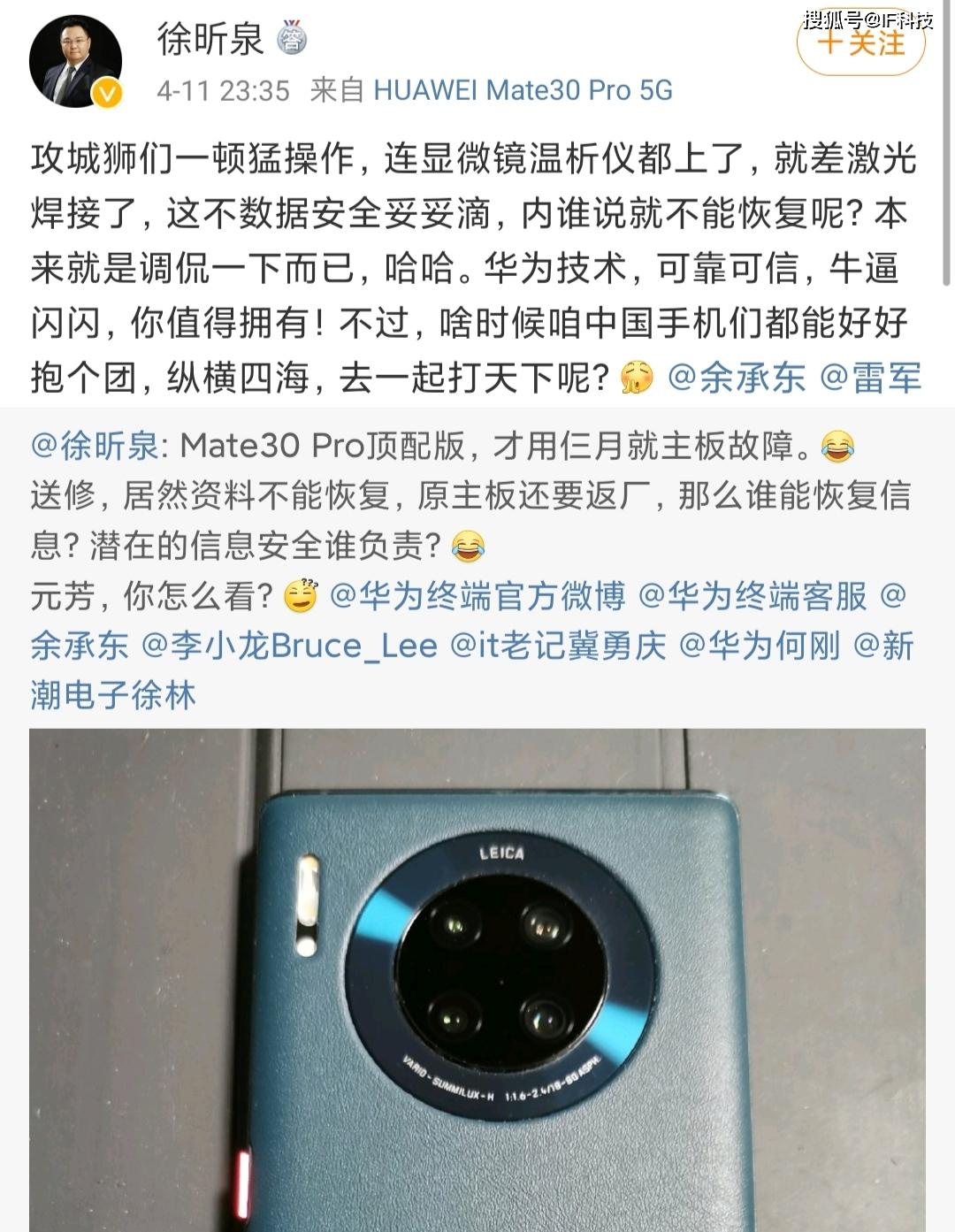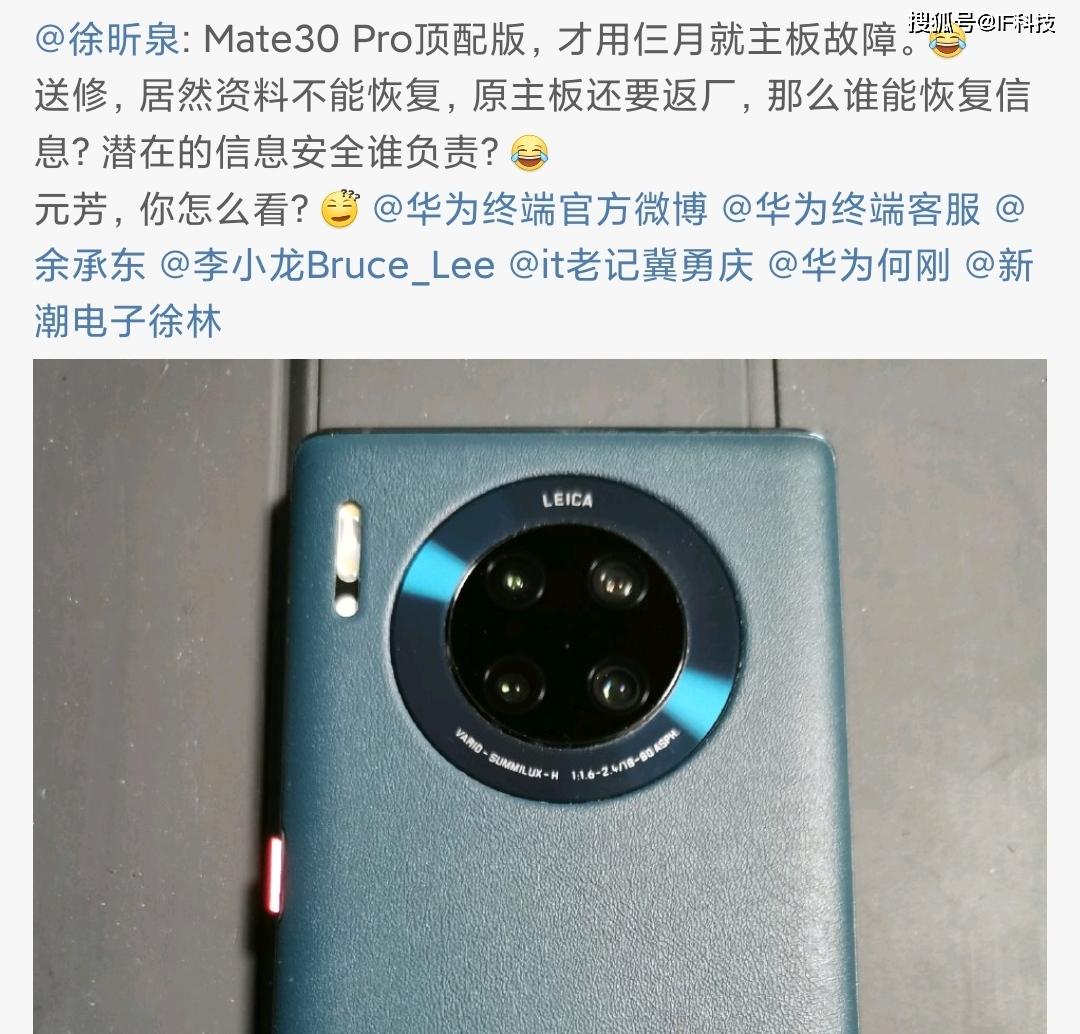 就在近日,华为前高管徐昕泉发文称Mate30 Pro顶配版,才用三个月就出现主板故障。而且送修不能恢复资料,原主板还要返厂。并质问多名华为现任高官称“那么谁能恢复信息?潜在的信息安全谁负责?元芳,你怎么看?”
