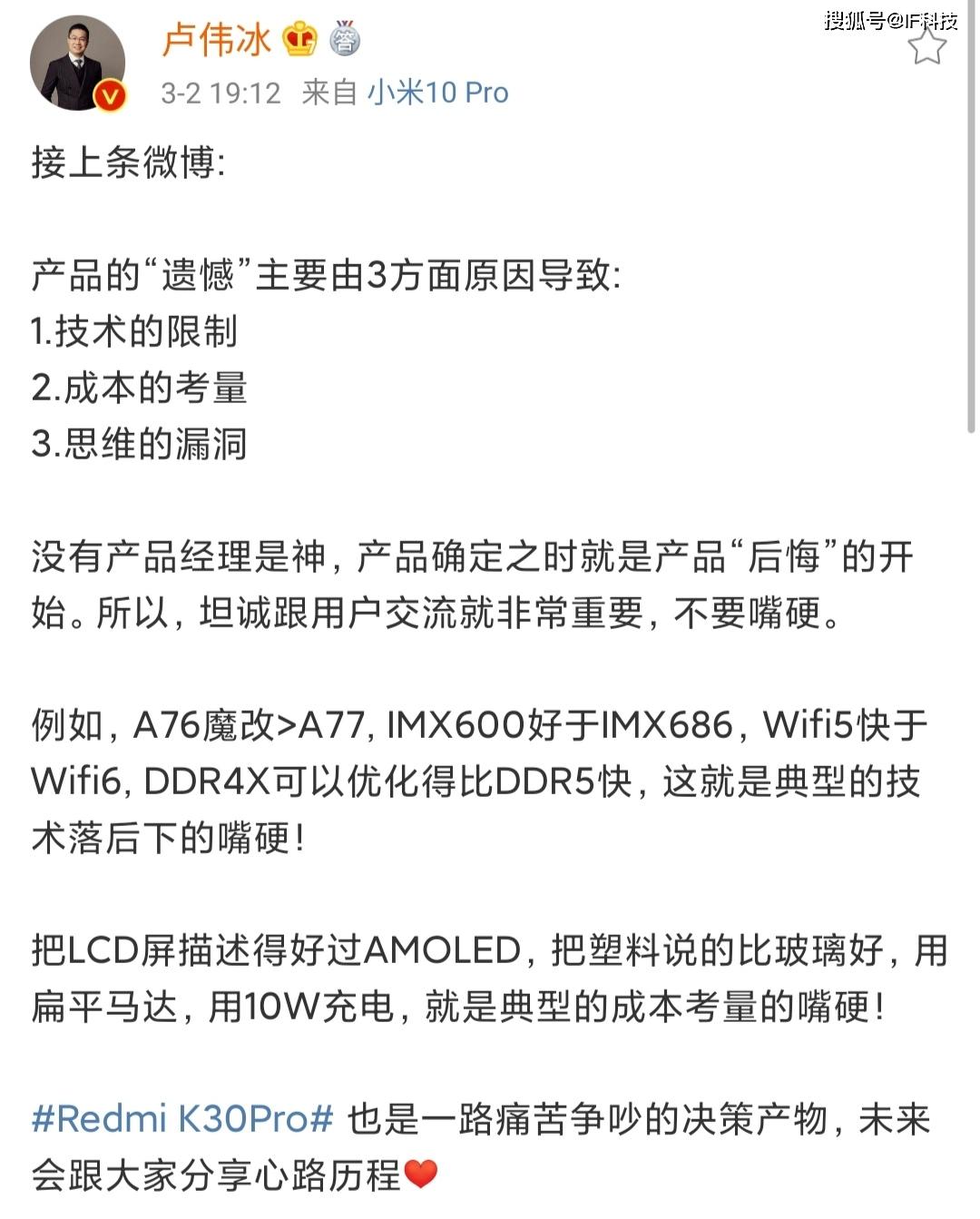 对于华为宣称自家手机技术遥遥领先友商的说法,第一个不认同的是小米,小米认为目前所有智能手机使用的硬件都是供应商提供的,华为拿到最新硬件的速度不如其它厂商,包括小米,所以卢伟冰多次发文抨击华为所谓的技术先进是通过“玄学”出来,比如抨击华为最新手机仍然使用上一代LPDDR4X,ARM上一代A76和G76核心,然后通过“玄学”得出这些落后的技术领先LPDDR5和G77、A77核心。