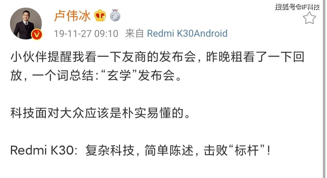 卢伟冰还说友商通过“诡辩”方式宣传wifi5比wifi6快,骁龙865不支持5G网络等等,并直接公开宣称友商V30系列就是一场“玄学”发布会,比如用“矩阵式相机”等词语进行玄学。相信关注国内手机圈的网友都知道,卢总在前段时间,每天发多条动态抨击华为技术落后,省成本,套娃机等。目前小米和华为已经成为手机行业水火不容的两个国产品牌。