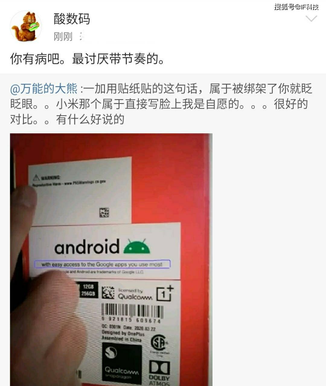 那么如今一加8的手机盒也用上了这句标语,而是今后越来越多的国产手机也会用,那么万能的大熊、HW前HR等米黑专业户会怎么看待这件事呢,万能的大熊发文称“一加用贴纸贴的这句话,属于被绑架了你就眨眨眼。小米那个属于直接写脸上我是自愿的。很好的对比。有什么好说的”,随后被一加产品经理“酸数码”抨击“你有病吧,最讨厌带节奏的”,很多一加用户和“花粉”都看不下去了,称其“驰名双标”。