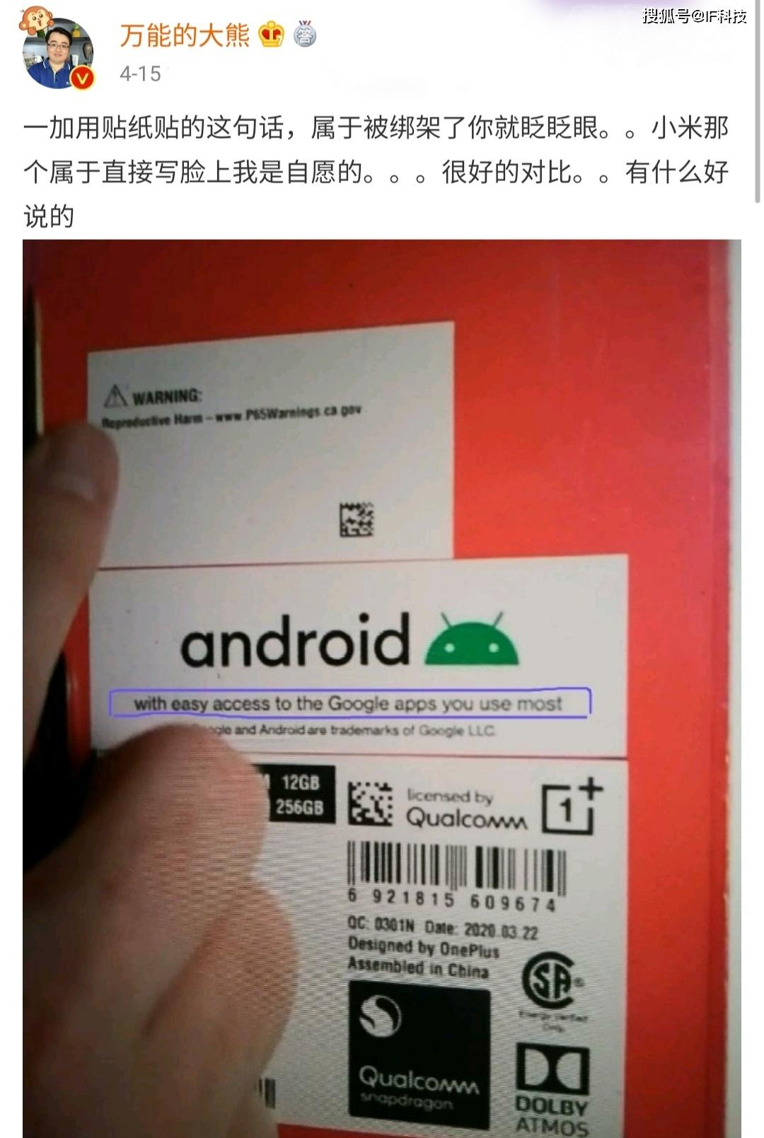 目前一加旗舰机一加8/8pro在美国首发,最高售价999美元,大约7040元,然而让这款产品上热搜的不是其该有的顶级硬件配置,而是手机包装盒上面那一句谷歌标语“欢迎您轻松访问谷歌应用”,之前小米10系列欧洲版的手机盒上也是用了这句标语,而被万能的大熊、HW前HR等米黑专业户带节奏,认为小米是嘲讽华为手机在国外被谷歌禁用GMS服务。根据了解,这是谷歌对除华为手机之外的所有安卓手机的要求,凡是最新旗舰机都必须在手机盒上加入这句标语。由于小米是为数不多进入欧洲市场的国产手机品牌,而是小米10发布时间比一加早,所以国内某厂商的kol将“落井下石”这个锅甩给小米。