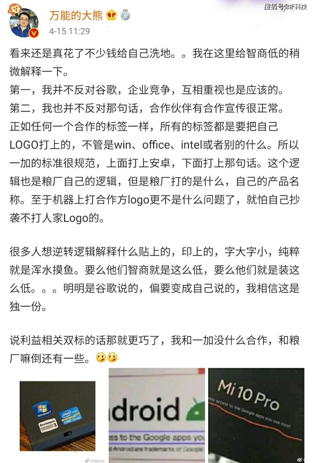 随后这名米黑专业户万能的大熊又发表长文称“看来还是真花了不少钱给自己洗地。。我在这里给智商低的稍微解释一下。第一,我并不反对谷歌,企业竞争,互相重视也是应该的。第二,我也并不反对那句话,合作伙伴有合作宣传很正常。正如任何一个合作的标签一样,所有的标签都是要把自己LOGO打上的,不管是win、office、intel或者别的什么。所以一加的标准很规范,上面打上安卓,下面打上那句话。这个逻辑也是粮厂自己的逻辑,但是粮厂打的是什么,自己的产品名称。至于机器上打合作方logo更不是什么问题了,就怕自己抄袭不打人家Logo的。很多人想逆转逻辑解释什么贴上的,印上的,字大字小,纯粹就是浑水摸鱼。要么他们智商就是这么低,要么他们就是装这么低。明明是谷歌说的,偏要变成自己说的,我相信这是独一份。说利益相关双标的话那就更巧了,我和一加没什么合作,和粮厂嘛倒还有一些”。可以看出万能的大熊已经下定决心会一直用双标模式狂黑小米。