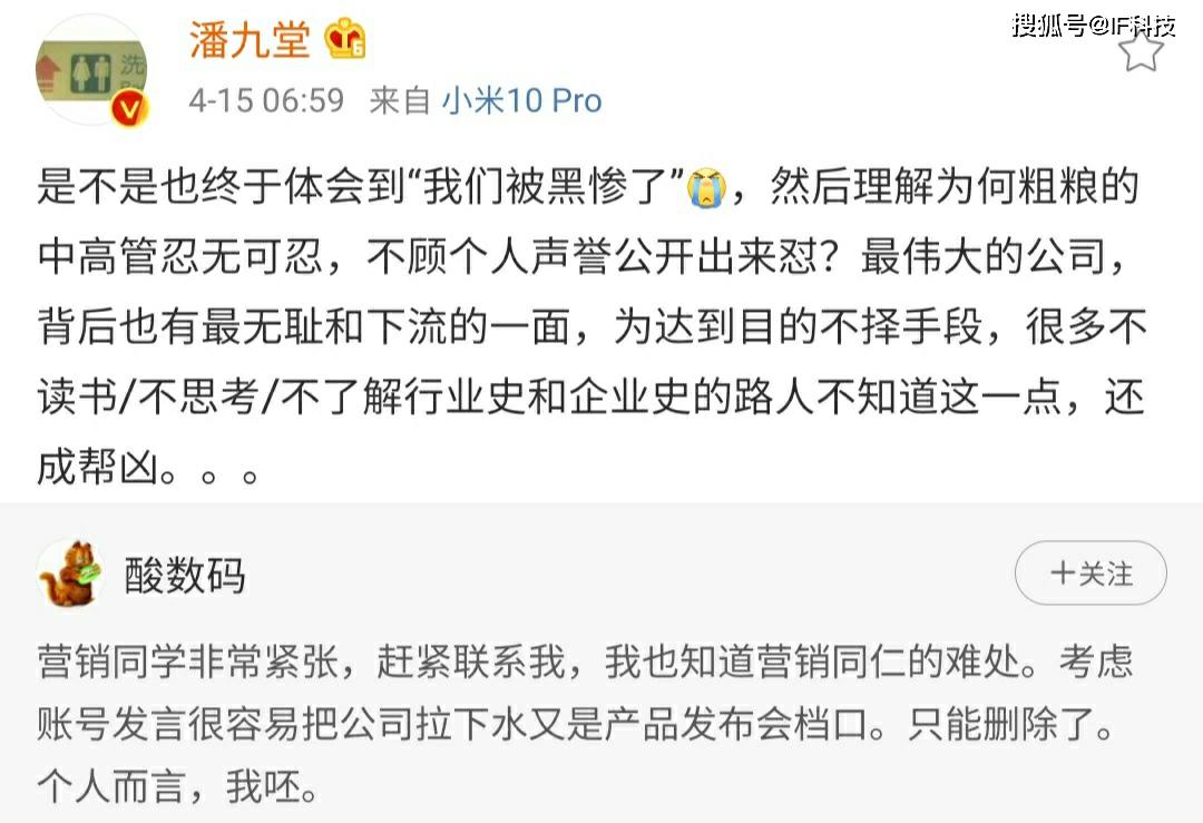 刚刚一加产品经理发文称“营销同学非常紧张,赶紧联系我,我也知道营销同仁的难处。考虑账号发言很容易把公司拉下水又是产品发布会档口。只能删除了。个人而言,我呸”。随后小米高管潘九堂评论称“是不是也终于体会到“我们被黑惨了”,然后理解为何粗粮的中高管忍无可忍,不顾个人声誉公开出来怼?最伟大的公司,背后也有最无耻和下流的一面,为达到目的不择手段,很多不读书/不思考/不了解行业史和企业史的路人不知道这一点,还成帮凶”。