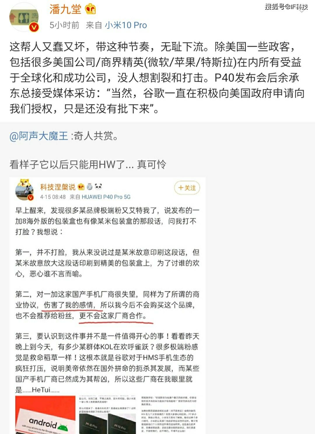 潘九堂还称“这帮人又蠢又坏,带这种节奏,无耻下流。除美国一些..,包括很多美国公司/商界精英(微软/苹果/特斯拉)在内所有受益于全球化和成功公司,没人想割裂和打击。P40发布会后余承东总接受媒体采访:“当然,谷歌一直在积极向美国..申请向我们授权,只是还没有批下来”。那么对于万能的大熊、HW前HR等米黑专业户用双标方式来黑小米,你有什么看法呢。
