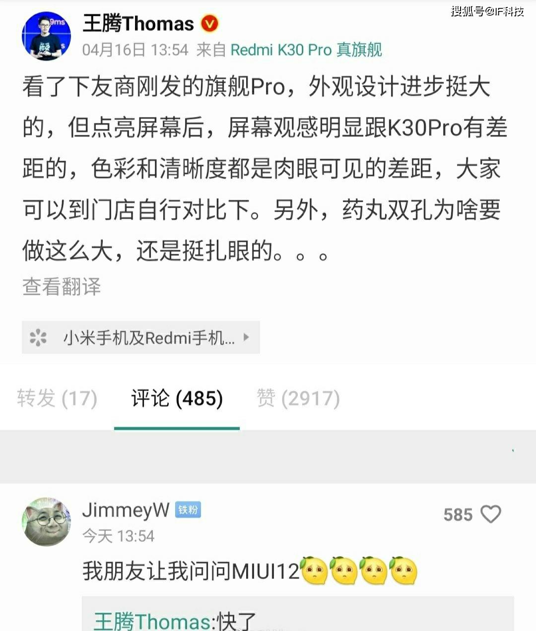 根据miui官方给出的最新公告,现在miui11最后一个开发版基本停止内测,并称“永远相信美好的事情即将发生”,可以确定MIUI12即将到来。今天小米高管发文称“看了下友商刚发的旗舰Pro,外观设计进步挺大的,但点亮屏幕后,屏幕观感明显跟K30Pro有差距的,色彩和清晰度都是肉眼可见的差距,大家可以到门店自行对比下。另外药丸双孔为啥要做这么大,还是挺扎眼的”。有网友问MIUI12什么时候来,王腾表示快了。