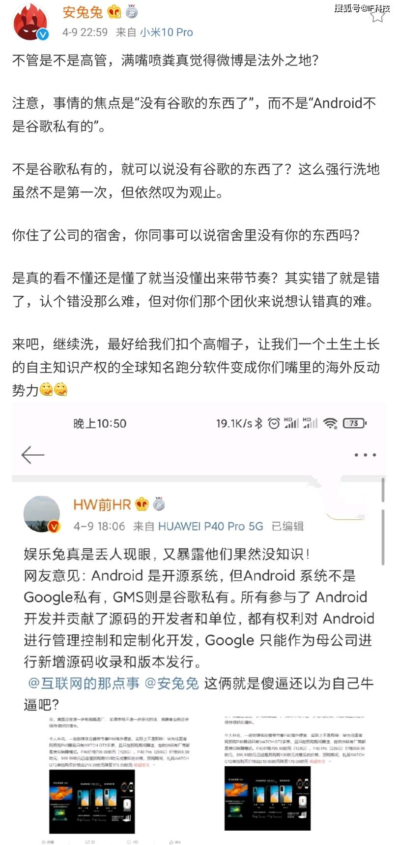 都知道在P40系列在国内发布后,余承东接受采访,回答了很多关于华为手机和谷歌、友商的相关问题,其中一个让很多消费者高兴但同时又让很多消费者质疑,余承东说P40已经完全没有谷歌的东西,所以不少人认为华为手机表面上用安卓系统,实际上已经被EMUI掏空,然而有人认为目前所有华为手机开机画面都显示系统基于安卓,另外都在使用安卓的应用,操作系统依旧是谷歌安卓。就因为这个问题,HW前HR和安兔兔开始进行互撕,前者是华为旗下KOL,后者是国内最知名的手机性能跑分平台,所以这次互撕得到很大的关注度。