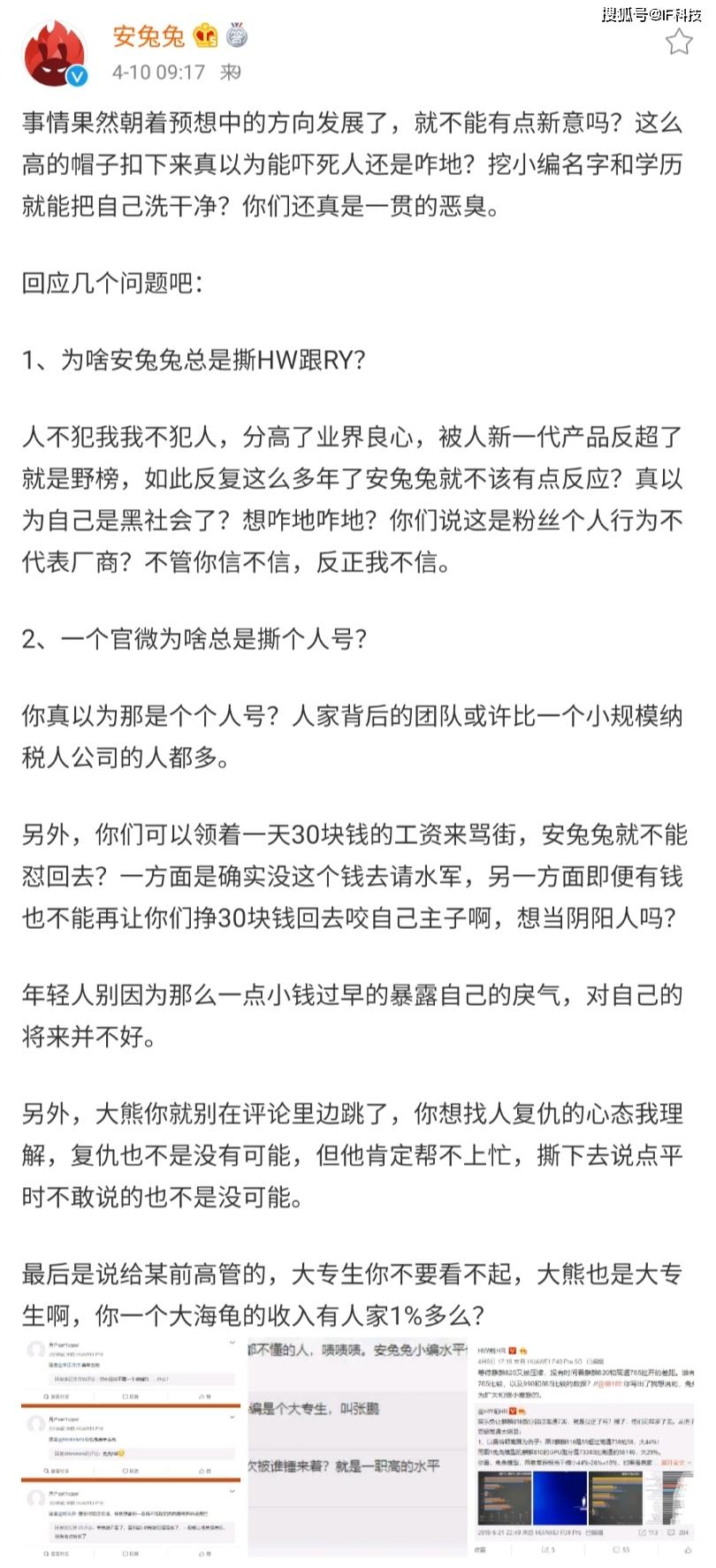这么多年的互撕,也有不少网友认为安兔兔一个官微不应该和那些米黑专业户个人号互撕,免得掉身价,然而安兔兔现在突然爆出猛料,称“人家背后的团队或许比一个小规模纳税人公司的人都多”。另外安兔兔还再次反击HW前HR等KOL,称“另外,你们可以领着一天30块钱的工资来骂街,安兔兔就不能怼回去?一方面是确实没这个钱去请水军,另一方面即便有钱也不能再让你们挣30块钱回去咬自己主子啊,想当阴阳人吗?年轻人别因为那么一点小钱过早的暴露自己的戾气,对自己的将来并不好”。