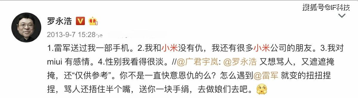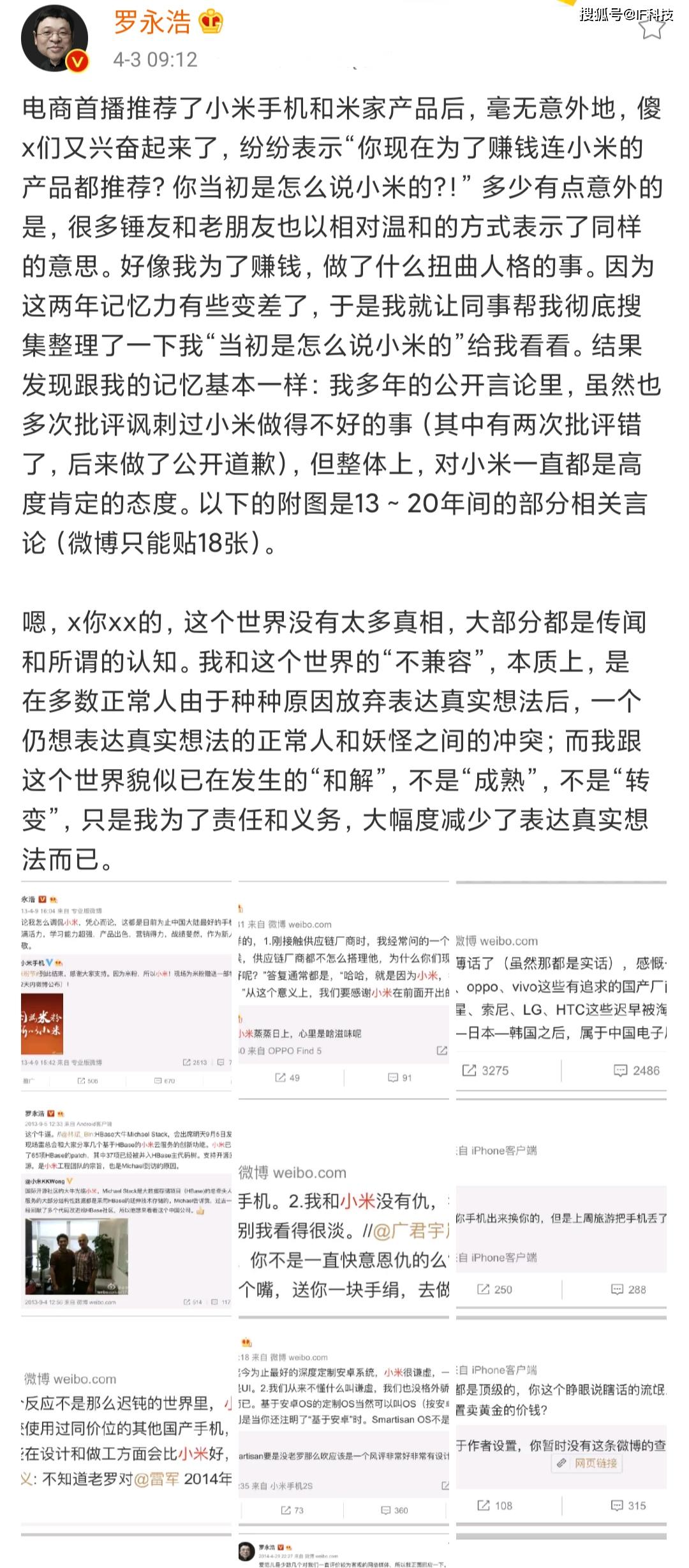 总之老罗宣布进入直播带货时,有大量网友对其进行抨击,现在取得巨大成功之后,又有很多人抨击老罗带货小米产品。就在刚刚,罗永浩首次发文嘲讽这些水军,称“电商首播推荐了小米手机和米家产品后,毫无意外地,傻x们又兴奋起来了,纷纷表示“你现在为了赚钱连小米的产品都推荐?你当初是怎么说小米的?!” 多少有点意外的是,很多锤友和老朋友也以相对温和的方式表示了同样的意思。好像我为了赚钱,做了什么扭曲人格的事。因为这两年记忆力有些变差了,于是我就让同事帮我彻底搜集整理了一下我“当初是怎么说小米的”给我看看。结果发现跟我的记忆基本一样:我多年的公开言论里,虽然也多次批评讽刺过小米做得不好的事(其中有两次批评错了,后来做了公开道歉),但整体上,对小米一直都是高度肯定的态度。以下的附图是13~20年间的部分相关言论(只能贴18张)”。
