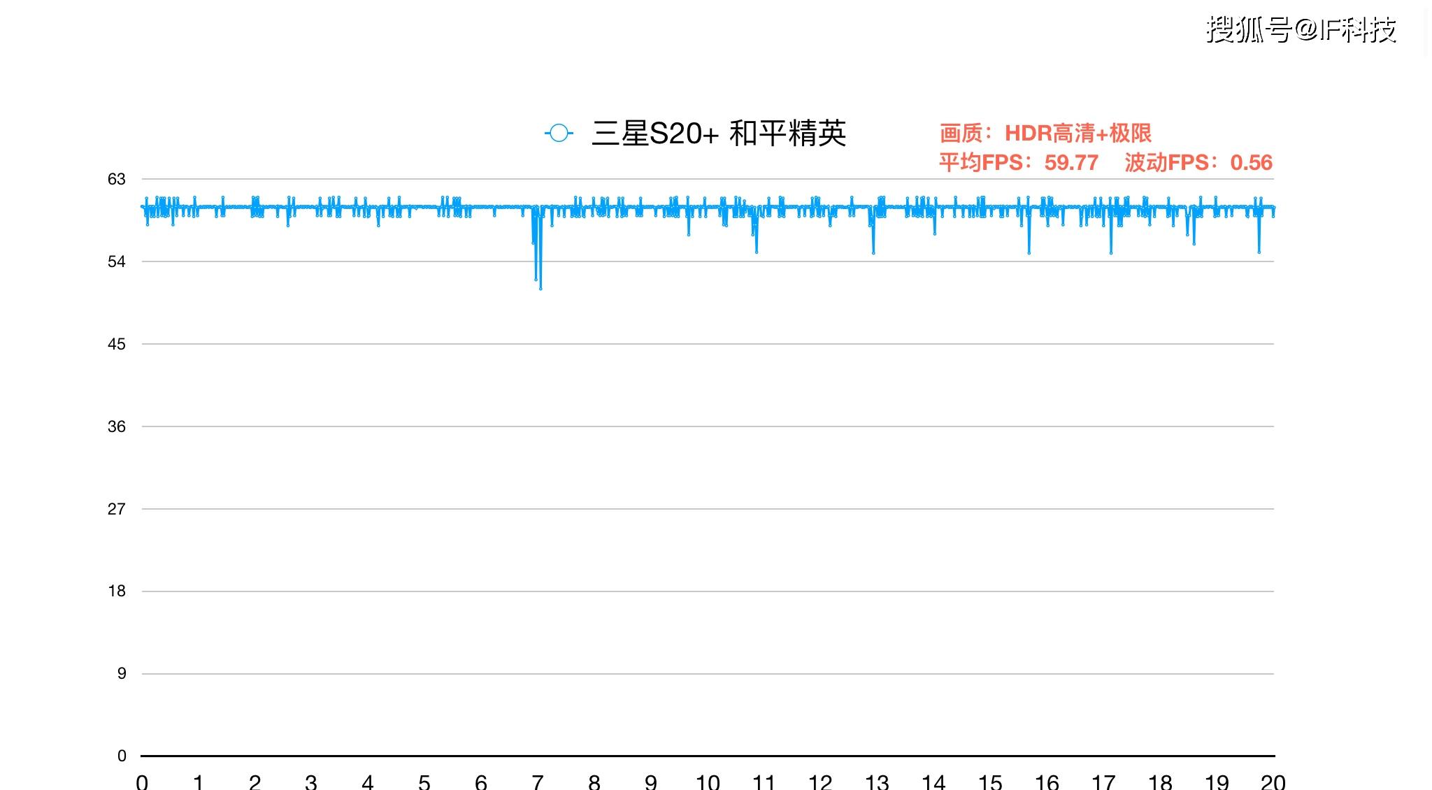 最后是对目前主流的大型手游测试帧率,三星S20+和平精英最高画质,HDR高清+极限,平均帧率59.77,帧率波动0.56。总结,S20系列各方面数据表现很完美,设计、产品定位、价格、硬件等方面都是实打实的高端。