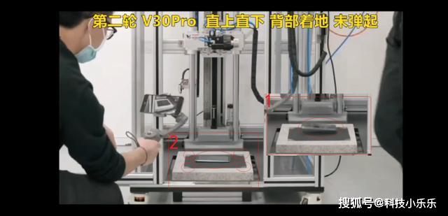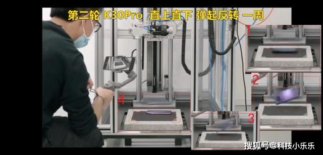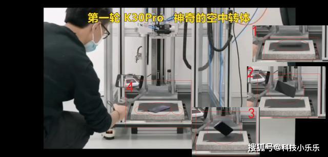 在第一轮测试中,V30Pro在空中转体之后,边角率先着地后后盖直接拍在花岗岩和砂纸上;至于K30Pro在空中转体之后,碰到花岗岩和砂纸时神奇的弹了起来,并再次转体,最后屏幕朝下落下。
