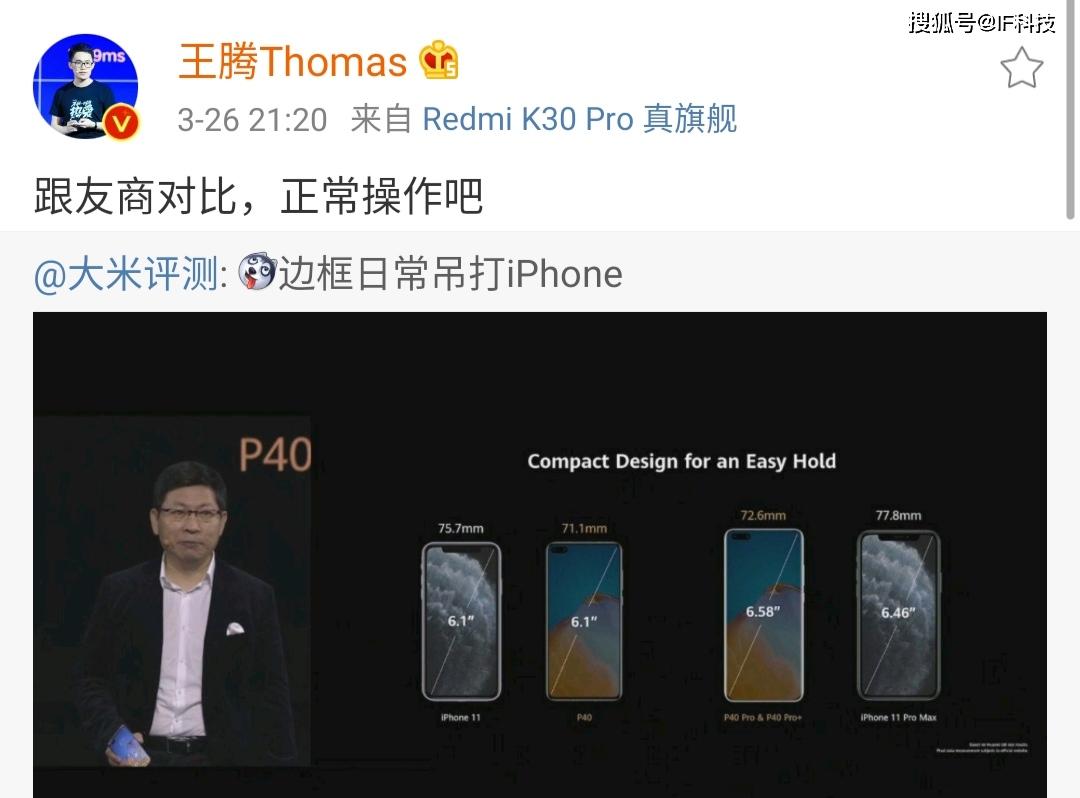 后来又网友找来Mate30Pro当时在发布会上的渲染图,与真机差别同样很大,卢伟冰回复称看来不止一次。值得一提的是,余承东将P40Pro与苹果11ProMax进行边框对比,后者顶部边框宽度为4.5mm,前者仅为2.65mm,差值为1.85mm,然而差值的宽度比2.65mm还要宽,显然这个边框对比不可信,而且P40Pro渲染图几乎没有边框,真机边框很宽。