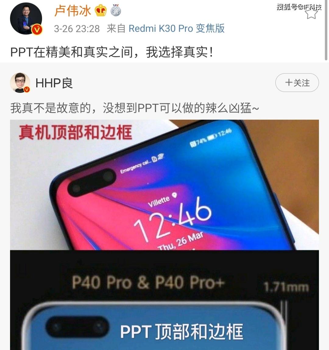 就在近日,卢伟冰、王腾等小米高管公开质疑华为P40系列虚假宣传,在P40系列发布会上,该机被渲染成四边无边框,然而和真机图片相比,边框宽度相差三倍以上,对此卢伟冰称“PPT在精美和真实之间,我选择真实”。