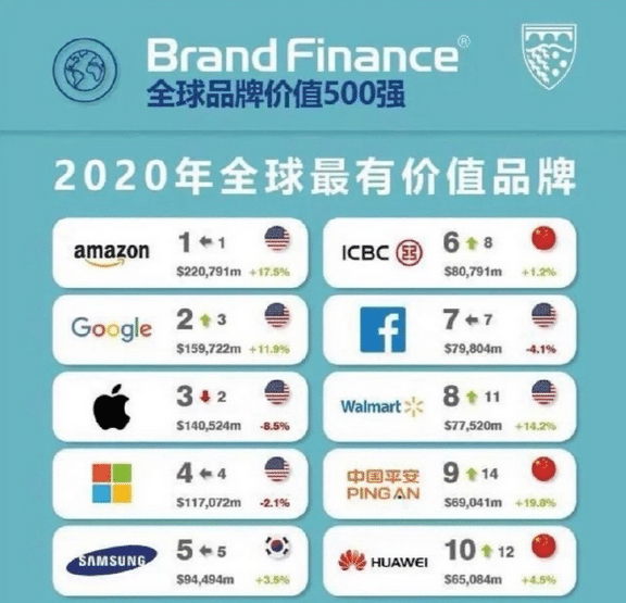 就在近日,2020年全球最具价值品牌排行榜便新鲜出炉了,从这份排行榜上我们可以看到,中国有三家企业进入了全球最具价值品牌排行榜的前十名,这三家企业分别是工商银行(ICBC)、中国平安以及华为,这也是我国历史上首次有三家企业进入全球最具价值品牌的前十名。