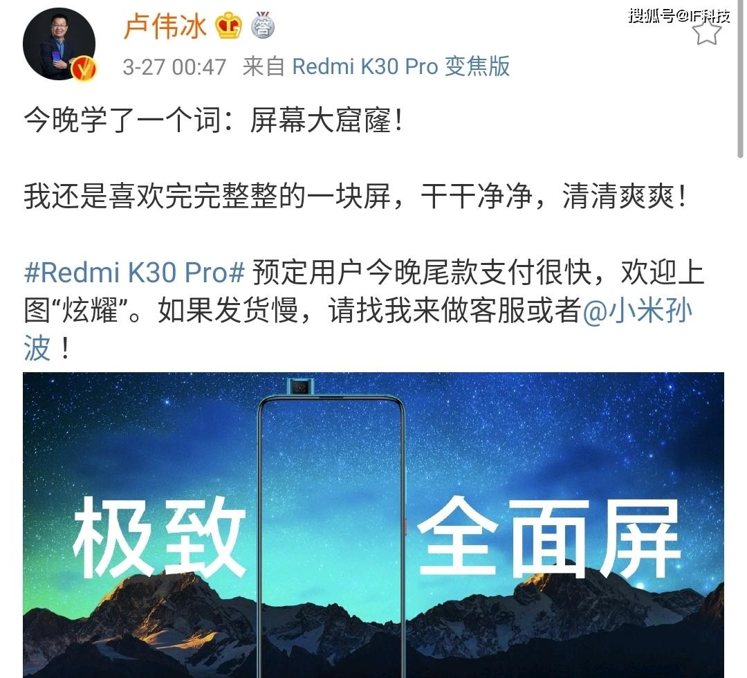 P40系列发布后,HW前HR快速删除动态,现在很多网友在其动态中评论“大窟窿”都会被拉黑。卢伟冰发文嘲讽称今晚学了一个词:屏幕大窟窿!我还是喜欢完完整整的一块屏,干干净净,清清爽爽。Redmi早就预测,2020年会是一个在设计上“前窗摆孔“的时代,所以我们选择了一条与众不同的道路!当然,为此我们也付出了巨大的代价。因为弹出式全面屏的设计,考验的是对产品整体架构的把握,产品整体设计和手感重量的精巧拿捏,以及成本的巨大增加。