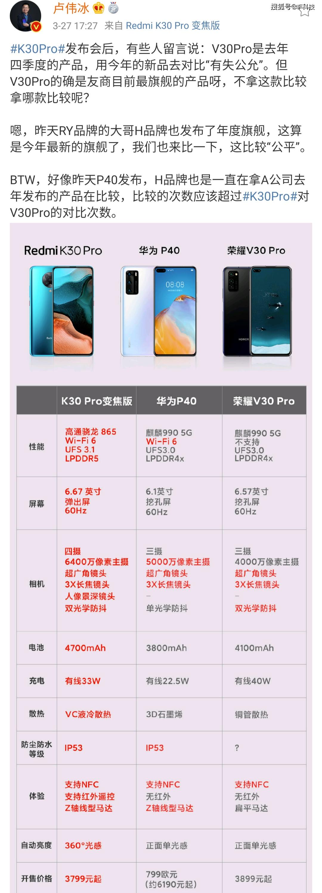就在刚刚,卢伟冰首次回应有失公允的手机对比,他称K30Pro发布会后,有些人留言说:V30Pro是去年四季度的产品,用今年的新品去对比“有失公允”。但V30Pro的确是友商目前最旗舰的产品呀,不拿这款比较拿哪款比较呢?嗯,昨天RY品牌的大哥H品牌也发布了年度旗舰,这算是今年最新的旗舰了,我们也来比一下,这比较“公平”。BTW(随便提一句),好像昨天P40发布,H品牌也是一直在拿A公司去年发布的产品在比较,比较的次数应该超过K30Pro对V30Pro的对比次数。
