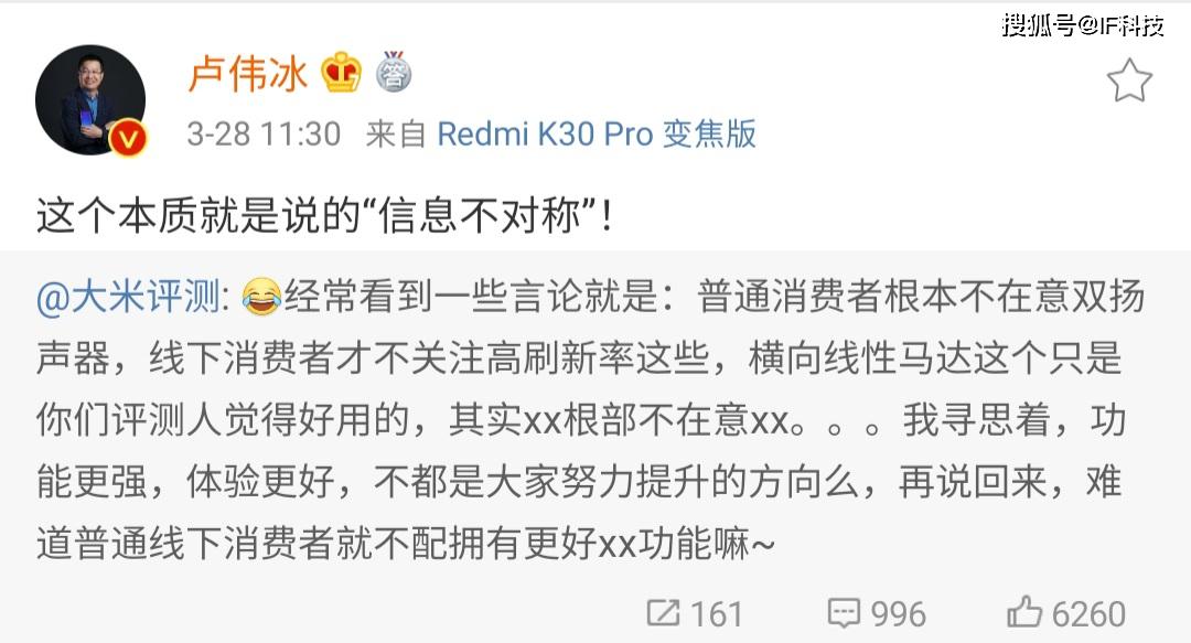不过并不是所有高价手机会使用线性马达,双扬声器,高刷新率,比如华为刚刚发布的P40,价格更高的p40pro也没有双扬声器。大米测评发文称“经常看到一些言论就是:普通消费者根本不在意双扬声器,线下消费者才不关注高刷新率这些,横向线性马达这个只是你们评测人觉得好用的,其实xx根部不在意xx。我寻思着,功能更强,体验更好,不都是大家努力提升的方向么,再说回来,难道普通线下消费者就不配拥有更好xx功能嘛”。随后卢伟冰转发称“这个本质上就是说信息不对称”。