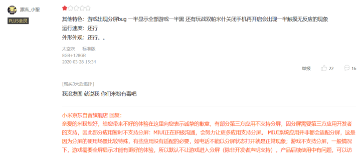 这位用户则是表示自己的红米k30 pro出现了分屏bug,会出现一半显示全部游戏一半黑的情况,还会出现局部屏幕没办法触摸的情况,但是当他追评时却是在吐槽这些米粉有毒,就因为他没有发图片就说他,由此可见,红米k30 pro发布之后某东评论区的情况与小米10发布时某东的评论区情况完全相同,莫非这是小米的优良传统?