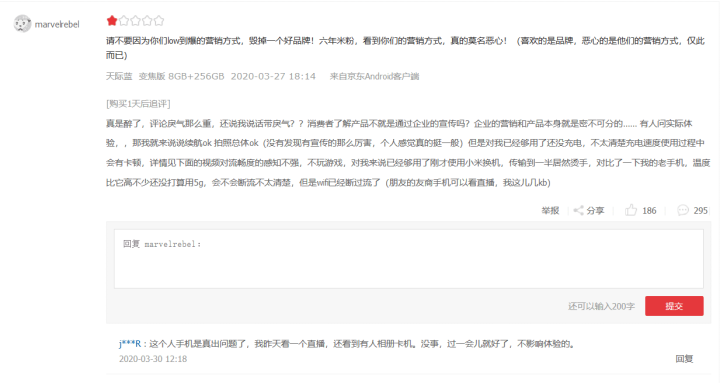 这位用户打差评的原因就比较有意思了,他第一次打差评的原因是因为恶心卢伟冰的营销方式,吐槽卢伟冰,看样子他的目的应该是希望雷军换掉卢伟冰这个人,应该算是一个资深米粉了,但是当他追加评价的时候却是在吐槽米粉们攻击他,并表示他的红米k30 pro出现了卡顿的问题,并附赠了一段视频,从视频中我们也是可以看出他的手机确实是有着非常严重的卡顿情况的(视频不知道什么原因在点开之后不显示,感兴趣的可以去某东红米k30 pro差评区查看),而这位用户下方的评论数也是达到了295个。