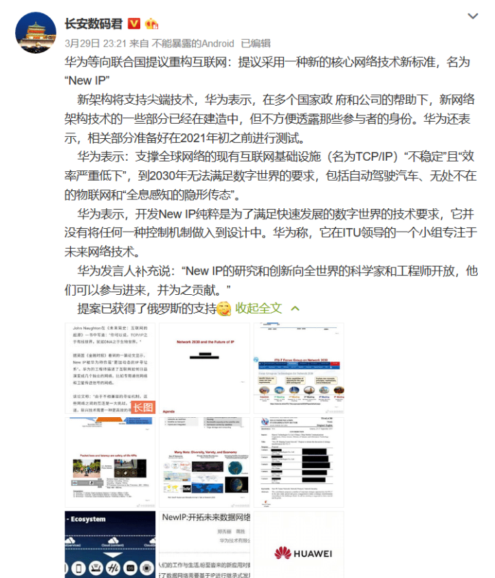 如今,华为再次推出了他的第四步计划:用New IP替代TCP/IP,据微博知名博主@长安数码君 所爆料的消息显示 ,目前的华为已经向联合国提出了重构互联网的请求,要用一种名为NewIP的核心网络技术标准来替代掉老旧的TCP/IP网络技术标准,而华为给出的理由也非常的充分:TCP/IP的网络技术标准“不稳定”且“效率低下”,无法满足2030年数字世界的要求。