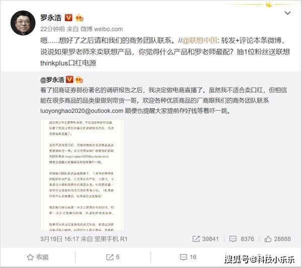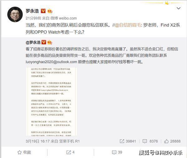 在最近罗永浩在微博上表示,其商务团队目前已经和OPPO相关团队进行了私信沟通。相信如果成功的话,或许在不久的将来,我们能看到罗永浩通过直播售卖OPPO新一代旗舰手机Find X2 Pro以及首款智能手表OPPO Watch。至于联想这边,基于联想还未决定好要让罗永浩直播售卖售卖产品,所以罗永浩对此在微博作出回应表示:嗯……想好了之后请和我们的商务团队联系。