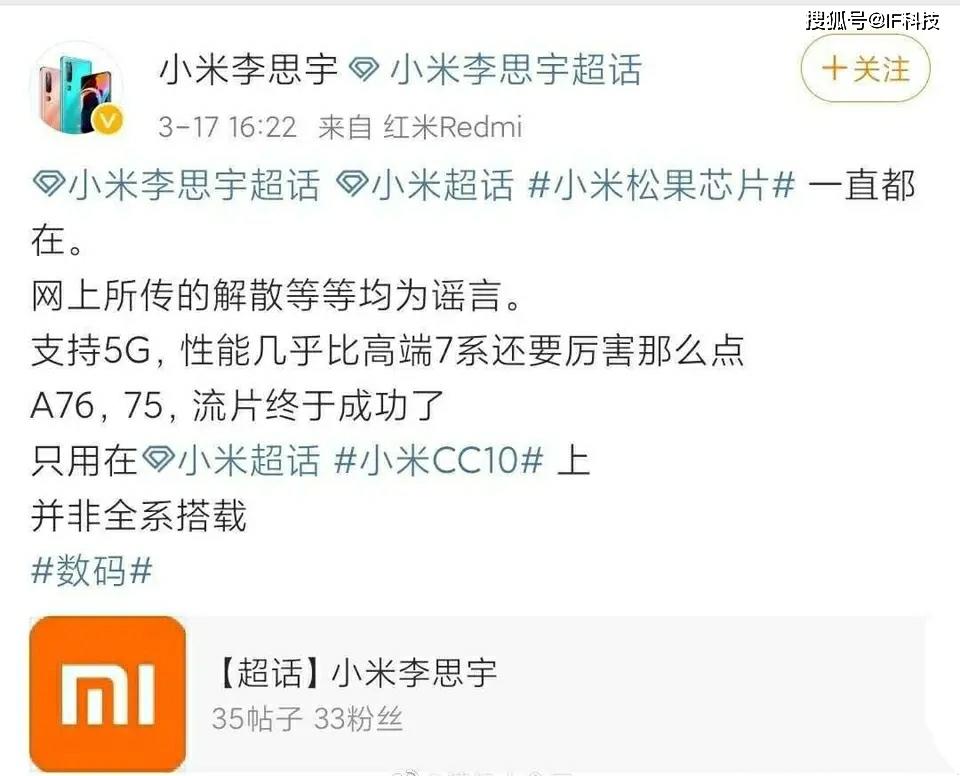 消息传出后,很多网友也分析了小米放弃自研芯片的一些原因,比如技术实力欠缺,小米产品性价比高,净利润很低,而且又是上市公司,这就会让澎湃芯片的研发投入大大降低。然而就在刚刚,小米超话主持人首次对澎湃芯片消失的话题进行辟谣,称网上所谓的解散都是造谣,澎湃最新一代芯片支持5G,性能比骁龙7系列还要厉害,采用A76+A75核心组合,目前已经流片成功,澎湃S2将首发在小米CC10上。