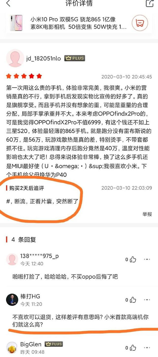 第一位用户表示其原本是想要去购买OPPO Find X2的,但是考虑良久过后觉得OPPO Find X2不值那个价位,所以才购买了小米10,结果到手之后发现小米10手机太热了,特别的汤,不带套根本就抓不住那种,可想而知是有多热了,此外,这位小米的小米10还出现了断流的现象,评价之后还要被人喷……