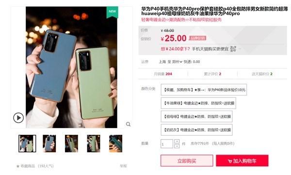 3月7日消息,一家天猫店铺开售P40系列保护套,售价25元。