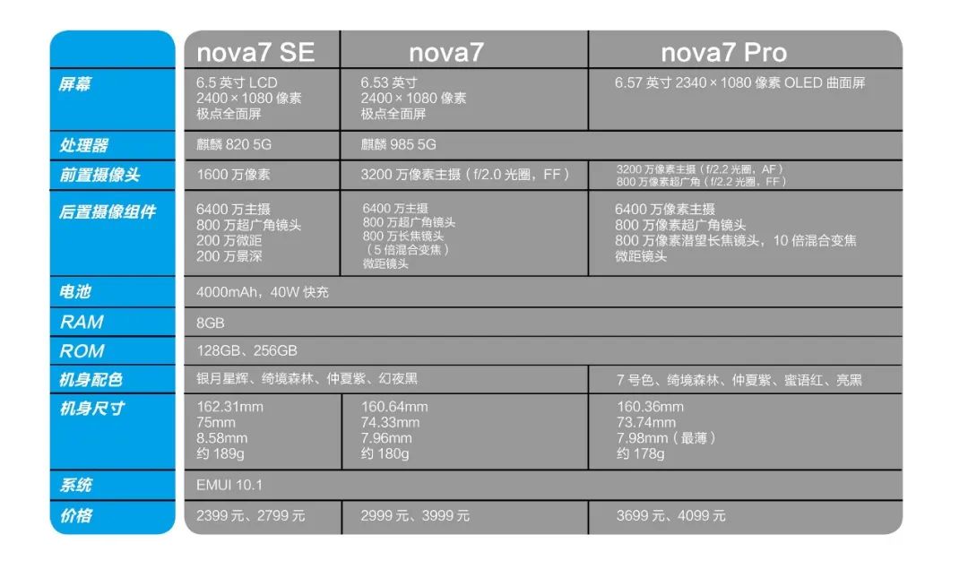 在屏幕配置上,nova7系列三款机型区别较为明显。nova7采用6.53英寸 20:9 FHD+OLED新极点全面屏(单孔),DCI-P3广色域;nova7 Pro则采用6.57英寸19.5:9 FHD+曲面屏(双孔),支持DCI-P3广色域。70°曲率,视觉观感更有高级感,视野更加开阔,同时握持体验更舒适。