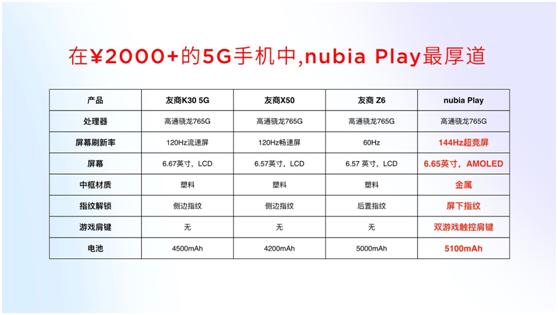 而主角努比亚Play作为同类机型中唯一拥有144Hz高刷新率屏幕,唯一拥有AMOLED材质,唯一拥有5100mAh超大电池、唯一拥有屏下指纹、唯一拥有双触控游戏肩键、唯一拥有金属中框的品质之作.