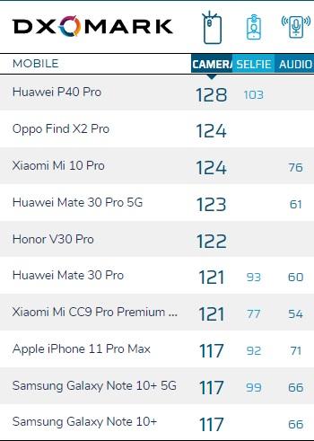 目前,DXOMARK上排名最高的是华为P40 Pro,分数为128分,其次是OPPO Find X2 Pro、小米10 Pro、华为Mate 30 Pro 5G等。