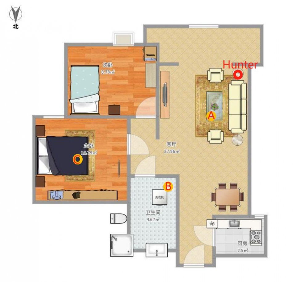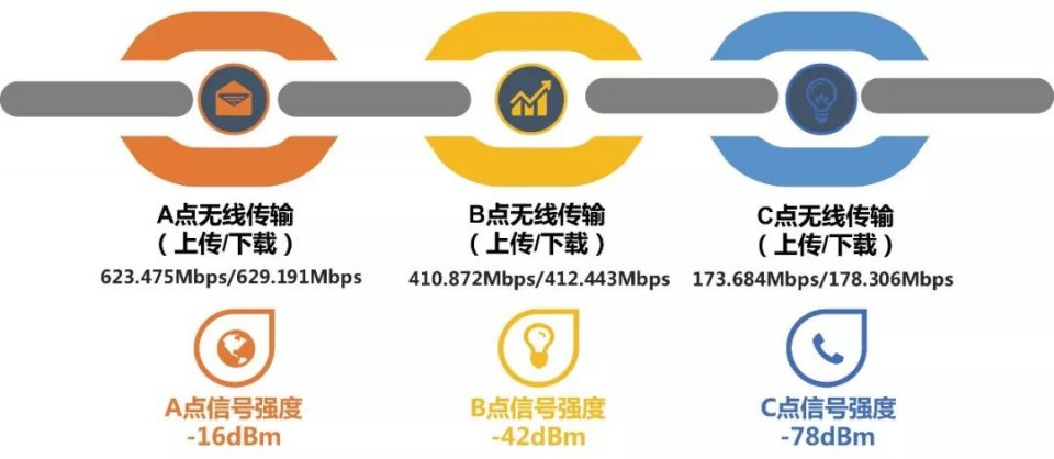 我一共选择了3个测试点,其中A点是距离路由器约1米(中间无障碍物),B点是距离路由器约3米隔一堵墙的位置,而C点则是距离路由器约5米间隔两堵墙的位置。