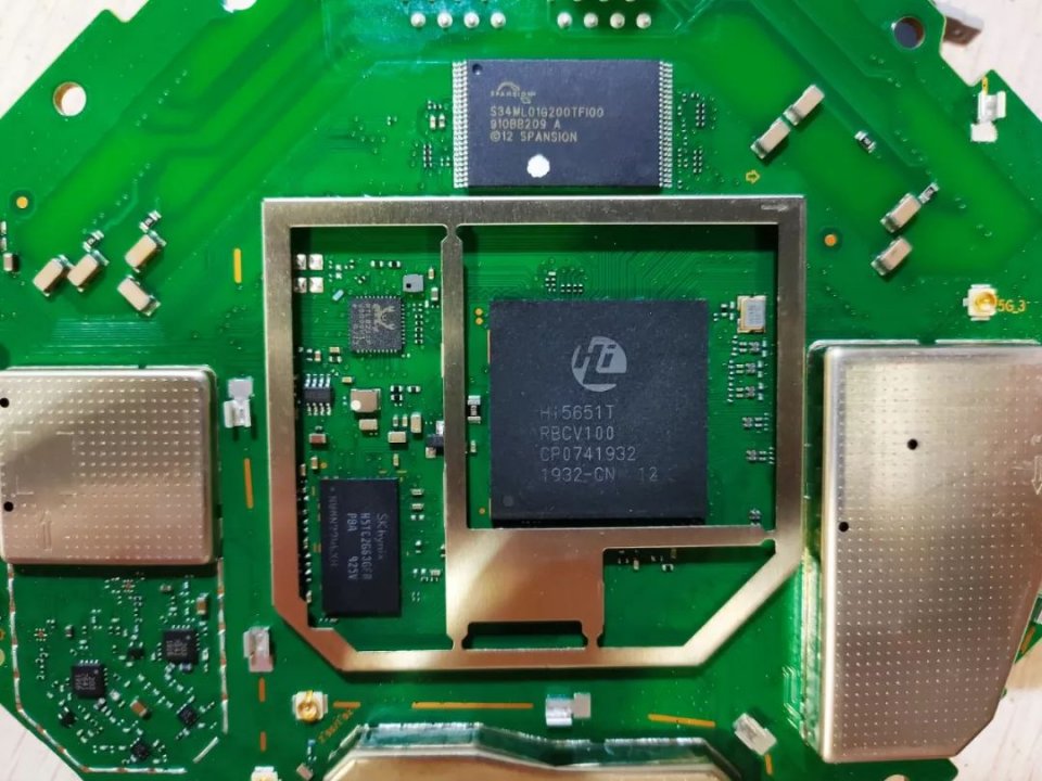 图注:中间这颗最大的就是荣耀猎人游戏路由的CPU,最上面这颗芯片是它的128MB闪存,左边这颗面积更大的芯片就是他的256MB LPDDR3内存芯片。