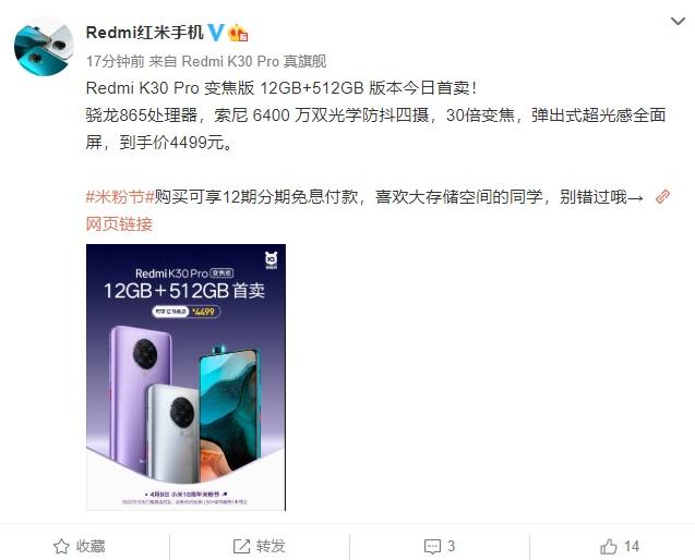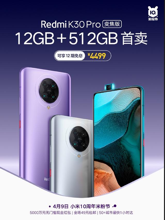Redmi红米手机官方表示,Redmi K30 Pro变焦版12GB+512GB今天首卖,搭载高通骁龙865处理器,配备索尼6400万双光学防抖四摄,到手价4499元。
