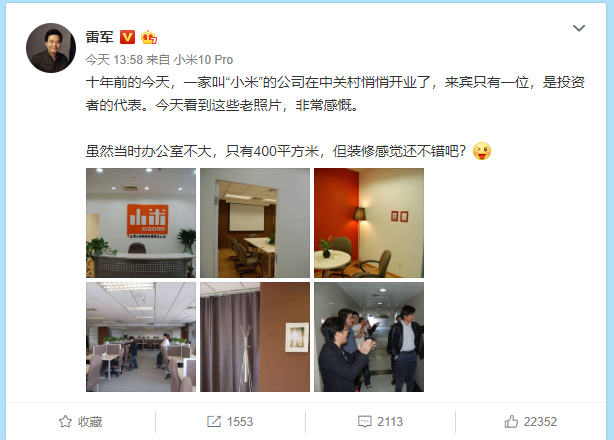 而后,雷军又发微博晒出了小米公司当年创立的时候办公室场景,雷军称,十年前的今天,一家叫“小米”的公司在中关村悄悄开业了,来宾只有一位,是投资者的代表。今天看到这些老照片,非常感慨。 虽然当时办公室不大,只有400平方米,但装修感觉还不错吧?同时雷军还晒出了当时小米的办公场地和当时的环境。并在下面的微博评论:“这样认真的小公司,应该有前途”。