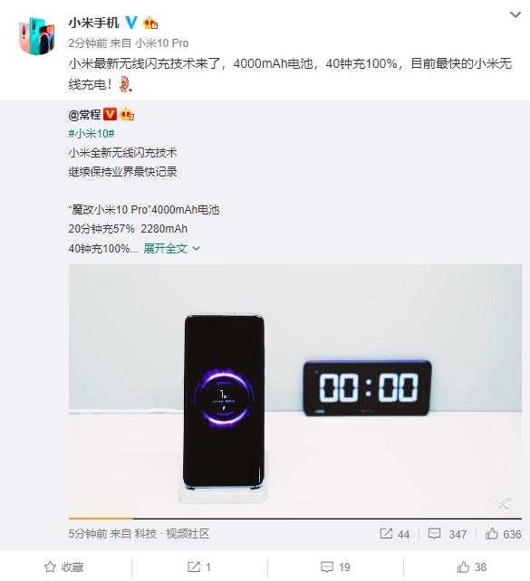 小米集团副总裁常程表示,小米全新无线闪充技术,继续保持业界最快记录,魔改小米10 Pro 4000mAh电池,40分钟充100%。独家40瓦无线+MI-FC闪充技术高速充电不发热,把无线充电带入全新时代。