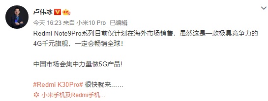 不过Redmi红米品牌总经理卢伟冰表示,Redmi Note9 Pro系列目前仅计划在海外市场销售,其市场定位为面向全球市场的4G千元旗舰,而Redmi将集中力量在中国市场做5G产品。同时他也表示新款Redmi K30 Pro很快就来。小米集团中国区总裁、Redmi品牌总经理卢伟冰透露,Redmi K30 Pro发布会将由自己来主讲,不仅有手机,还有其它新品,各大网友也猜测或许还会发布Redmi WiFi 6路由器、Redmi手环或者Redmi平板等等。