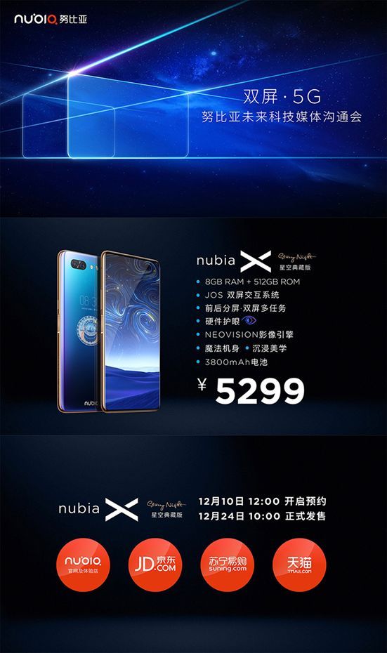 努比亚X星空典藏版8GB+512GB售价5299元,已于2018年12月10日12点在努比亚官方商城、努比亚全国线下体验店、京东官方旗舰店、天猫官方旗舰店以及苏宁易购官方旗舰店全面开启预约,并于12月24日上午10点在全平台正式开售。同时努比亚X海光蓝8GB+128GB版本售价3799元,将在以上全平台同期开启预约、于12月21日10点正式开售。