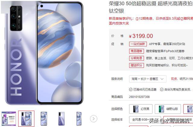 首先最近比较火的荣耀30价格就是3000档的,6G运存版卖2999,8G运存版本3199,这手机说白了卖点就两个麒麟985处理器尝鲜、再就用上了IMX600传感器+50倍长焦,40W充电也勉强算一个吧,外观设计时尚一点讨年轻人喜欢。