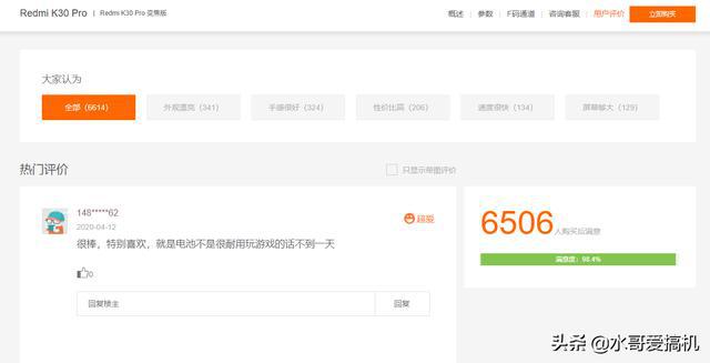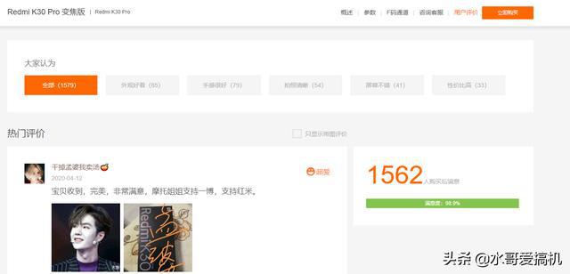 本着严谨的态度我还是决定给大家探究一下啊,首先当然是从官网看评价数据啊,这是都是我4月13号截取的数据,你如果是过两天才看到我的文章,那么就会有些出入了,K30Pro普遍版本的评价在6500+,变焦版的评价在1562+!