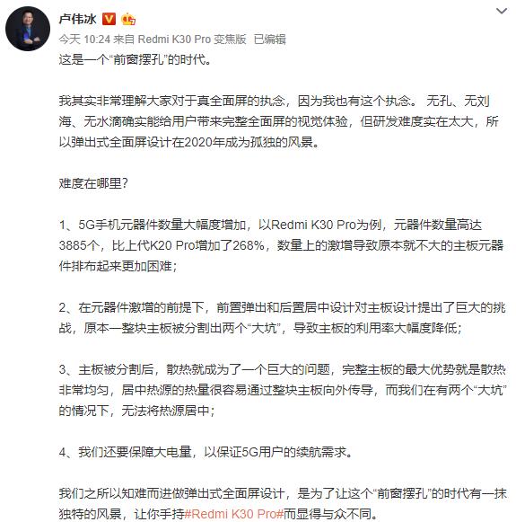 红米K30 Pro将于近期发布,在前几天和荣耀V30 Pro的对比中,网友看到,在红米K30 Pro的正面屏幕上,没有任何的开孔,由此判断该机采用了升降式摄像头,而通过卢伟冰和官方渲染图的确认,红米K30 Pro确实延续了升降式摄像头的设计。