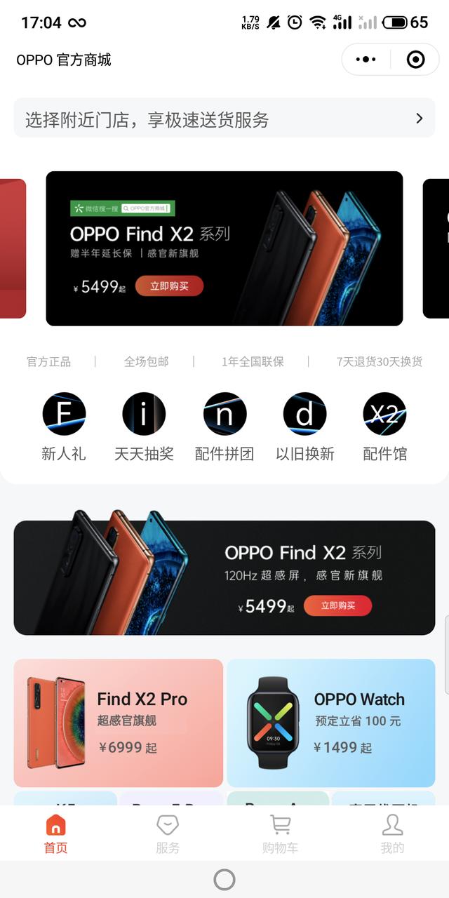 进入OPPO在线门店的方式很简单,搜索进入微信小程序“OPPO官方商城”即可。进入之后可以看到,既有OPPO Find X2系列、OPPO Reno3系列热门5G手机,也有潮流时尚的K系列、A系列手机。另外,OPPO Watch、真无线耳机、手机配件等也都上架齐全。